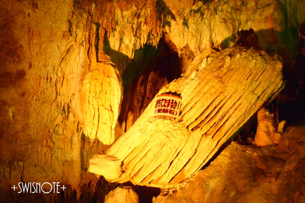 途中にはこんな鍾乳石がありましたよ…「おちてたまるか!」の受験石です。今がちょうど受験シーズンですから、タイムリーな話題になりますね~。