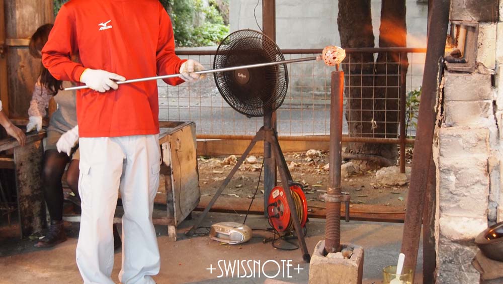 まずはベースとなる素材を選んで、そこに細かい色ガラスを装飾していくのですが、色はお好みで選ぶことが出来ます。私は白いガラスのベースに全色をまんべんなく散りばめることにしました。下の写真が私がガラスを吹いたあとのグラスを、スタッフの方に成形して頂いています。